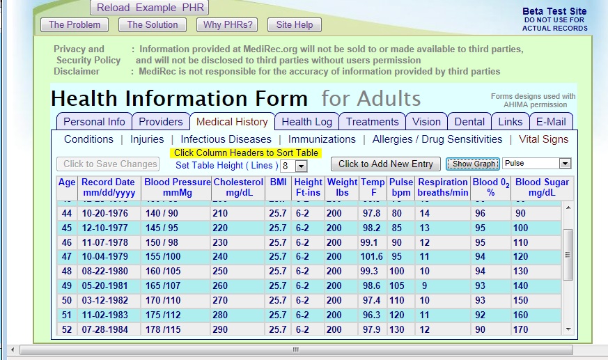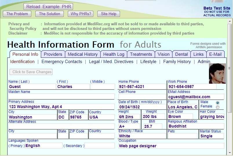 Although information can be entered in some parts of the site, as it doesn't currently have a database implemented, data cannot be saved. But the accompanying www.medirec.us web site is a less comprehensive but fully functional earlier version of a PHR web site, with far fewer tabs and fields, but with a database. And it does have some real-world users.