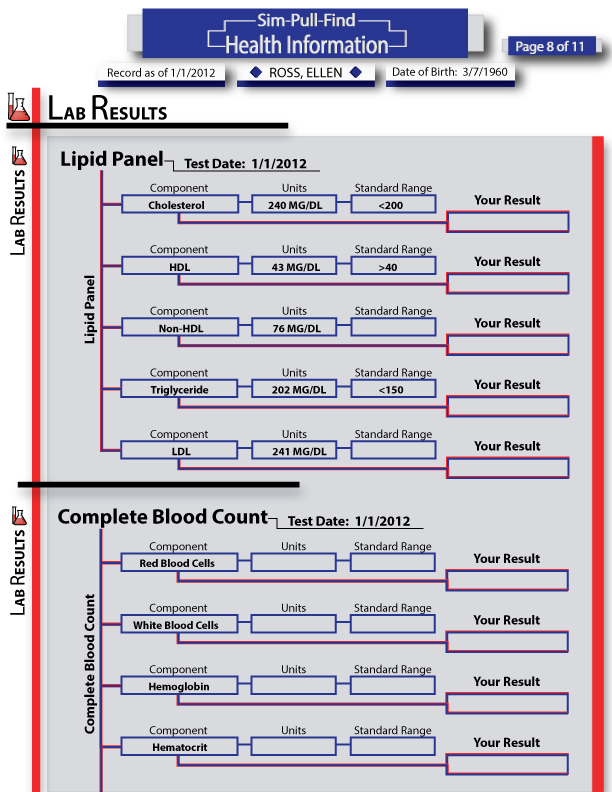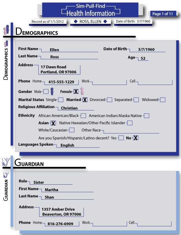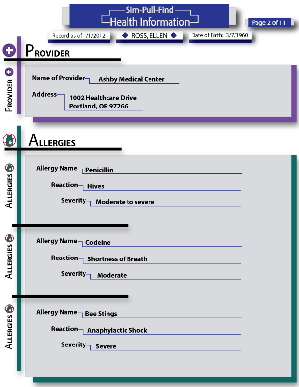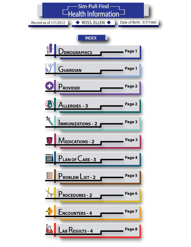 This design makes medical files easier to interpret using a key for the health categories that includes icons, colors, and line design making it simpler for the user to find and pull out necessary information quickly and efficiently. The simple to use and easy to remember design will aid doctors, health care providers, guardians and patients by saving valuable time regarding healthcare. Users can find information quicker through category color recognition. This design will better serve people for which English is not their first language, as they can rely on universal icons verses actual words. The user can add to this information either pre-print or when Sim-Pull-Find Medical Information is printed out. The index and all pages have the patient’s name, date of birth, and the date the record was printed. The index gives a snapshot of the number of medications, allergies, immunizations, etc. for a quick reference of what is to follow for the patient. Each category is divided using lines and icons to point to and highlight patient information and help the eye follow and locate pertinent information with speed and ease. Forms sometimes propose a problem for people when the information and the category do not exactly line up when printed out. To solve this problem, design lines that resemble a flow chart guide the eye from one to the other. These lines are also helpful regarding the lab results as they can link your eye from the test and type directly to the result. By creating a successful design for a patient’s medical information, the end result will be a more efficient and effective process for doctors, healthcare providers, guardians, and patients, which can only aid in the improvement of a patient’s overall health and care.
