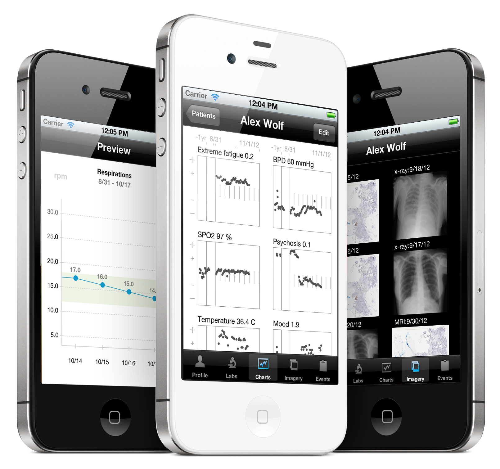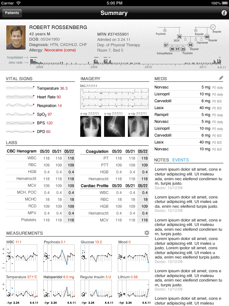 EMR version for medical professionals gives the benefit of viewing all information in one screen (tablet screen or printed page). Now using our design MD sees a full summary of diagnosis, allergy, patient attributes, medications, labs, hospitalizations, genogram, clinic visits, vital signs, significant events, notes, measurements, X-rays and MRI – all in one screen. MD can also see the dependencies and relationships between patient vital signs and medications. More than this medical charts show all historical data to identify trends, changes and discover problems. Charts could be enlarged to see the details by single click. MD can also change layout of vital signs and medication to create visual continuity between related metrics, based on patient symptoms or diagnosis. Looking into the whole picture of patient’s data, medical professional makes decisions faster and reliably.