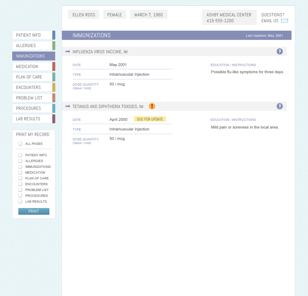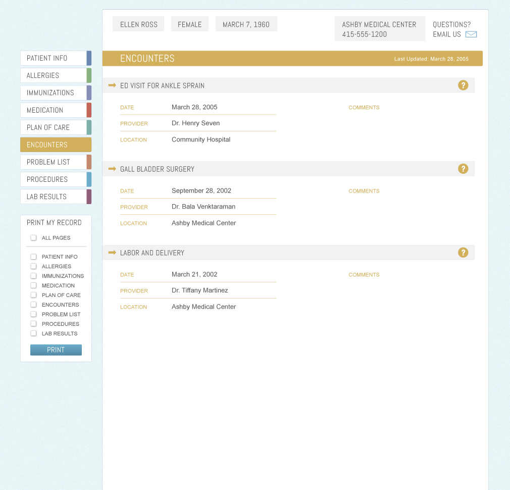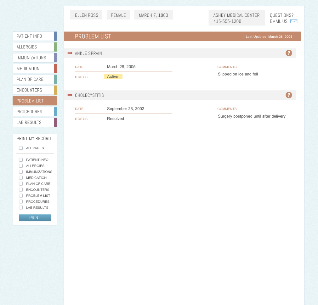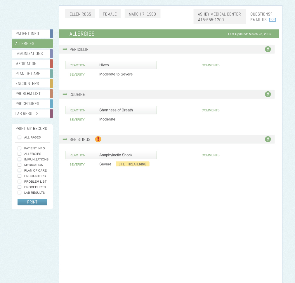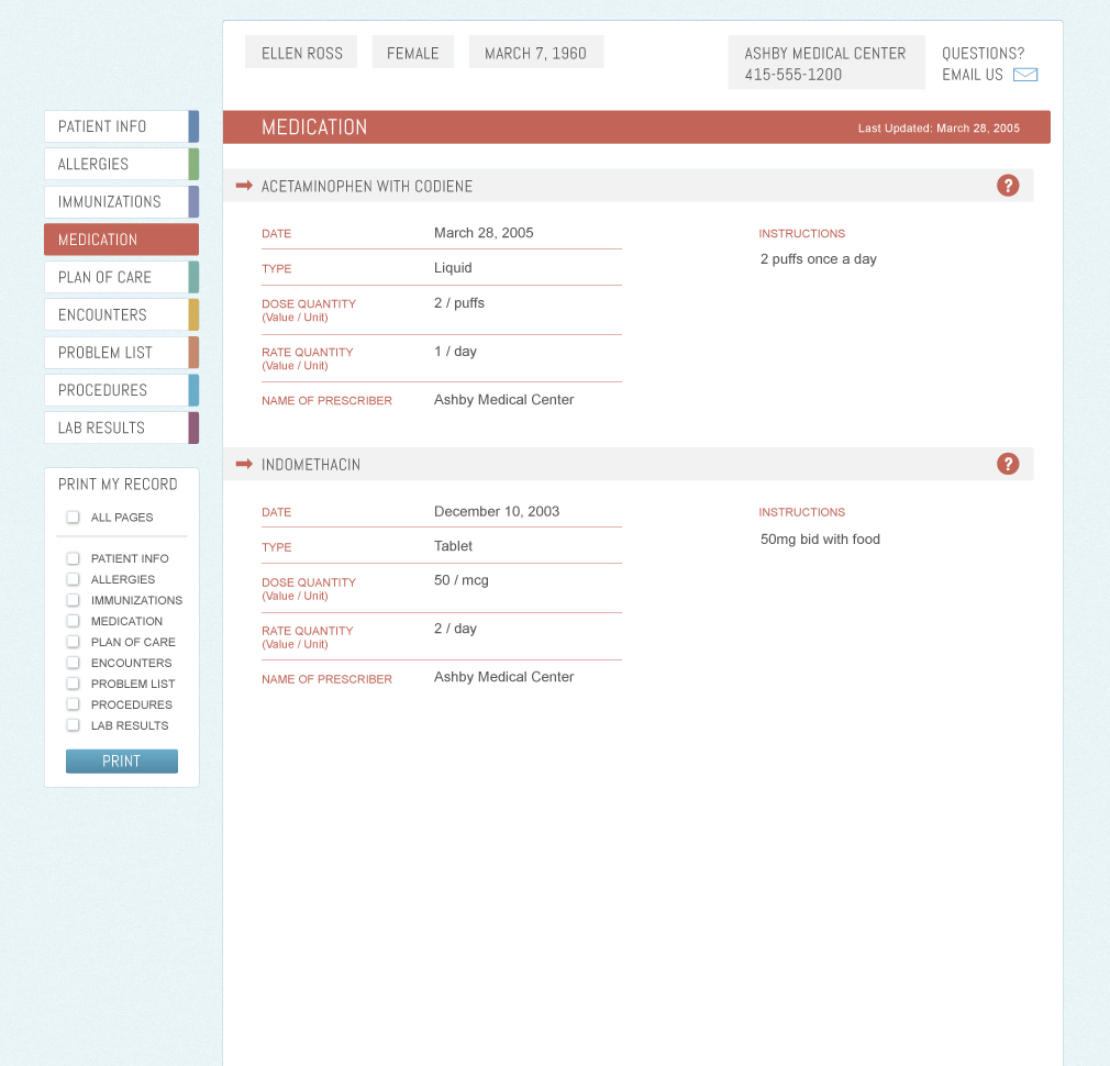 This design organizes the patient's information in a clean, easy to use interface with a color coded tab navigation system. Each section is clearly labeled with its own assigned color. Important information in the patient's record is highlighted, with an extra emphasis on immediate or risk related items. Questions a patient may have concerning names of treatments and the like can be immediately addressed from descriptions and/or definitions contained in a pop-up window from clicking on the question mark icon. Printing a medical record is made easy with a widget providing the user customizable printing options.