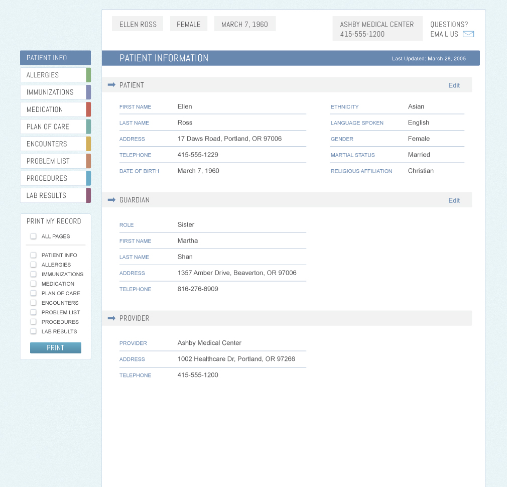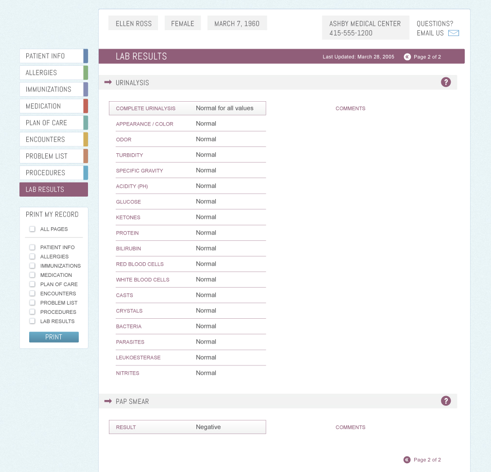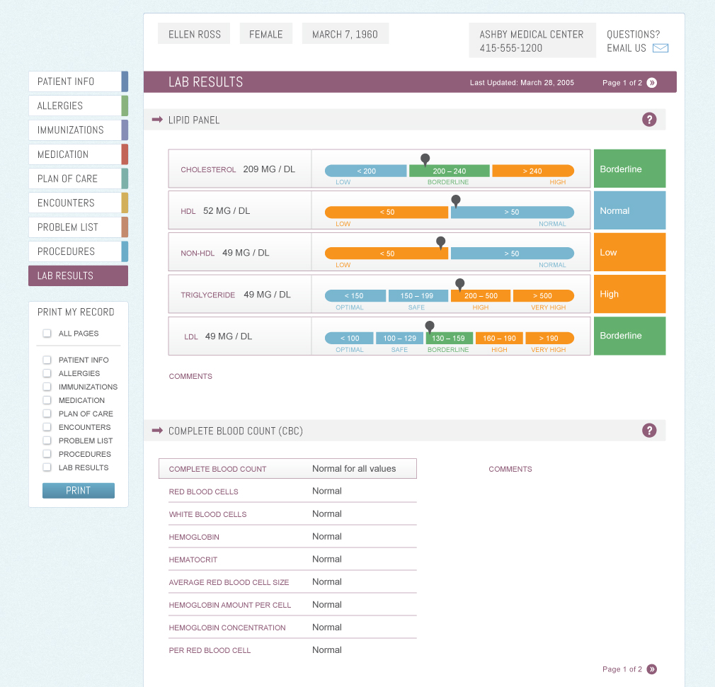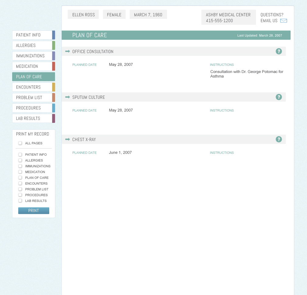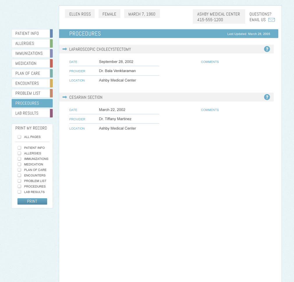This design organizes the patient's information in a clean, easy to use interface with a color coded tab navigation system. Each section is clearly labeled with its own assigned color. Important information in the patient's record is highlighted, with an extra emphasis on immediate or risk related items. Questions a patient may have concerning names of treatments and the like can be immediately addressed from descriptions and/or definitions contained in a pop-up window from clicking on the question mark icon. Printing a medical record is made easy with a widget providing the user customizable printing options.