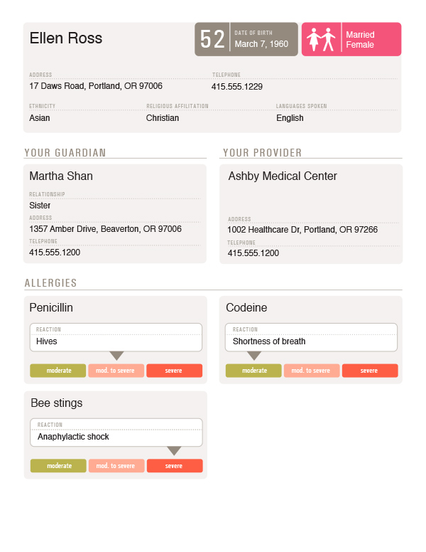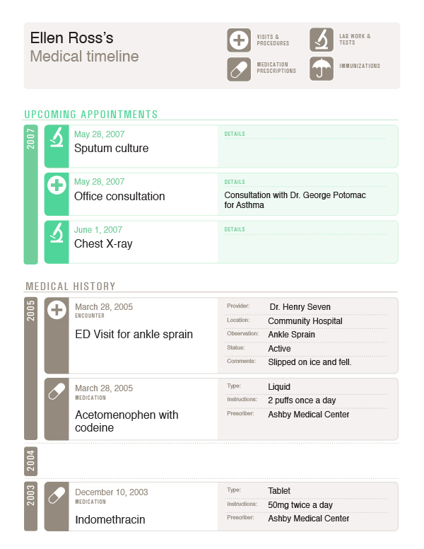 The new medical record is geared towards the patient. It presents patient information in an approachable way. It's easy to follow the medical history through a timeline which presents each visit, procedure and medical prescription chronologically.