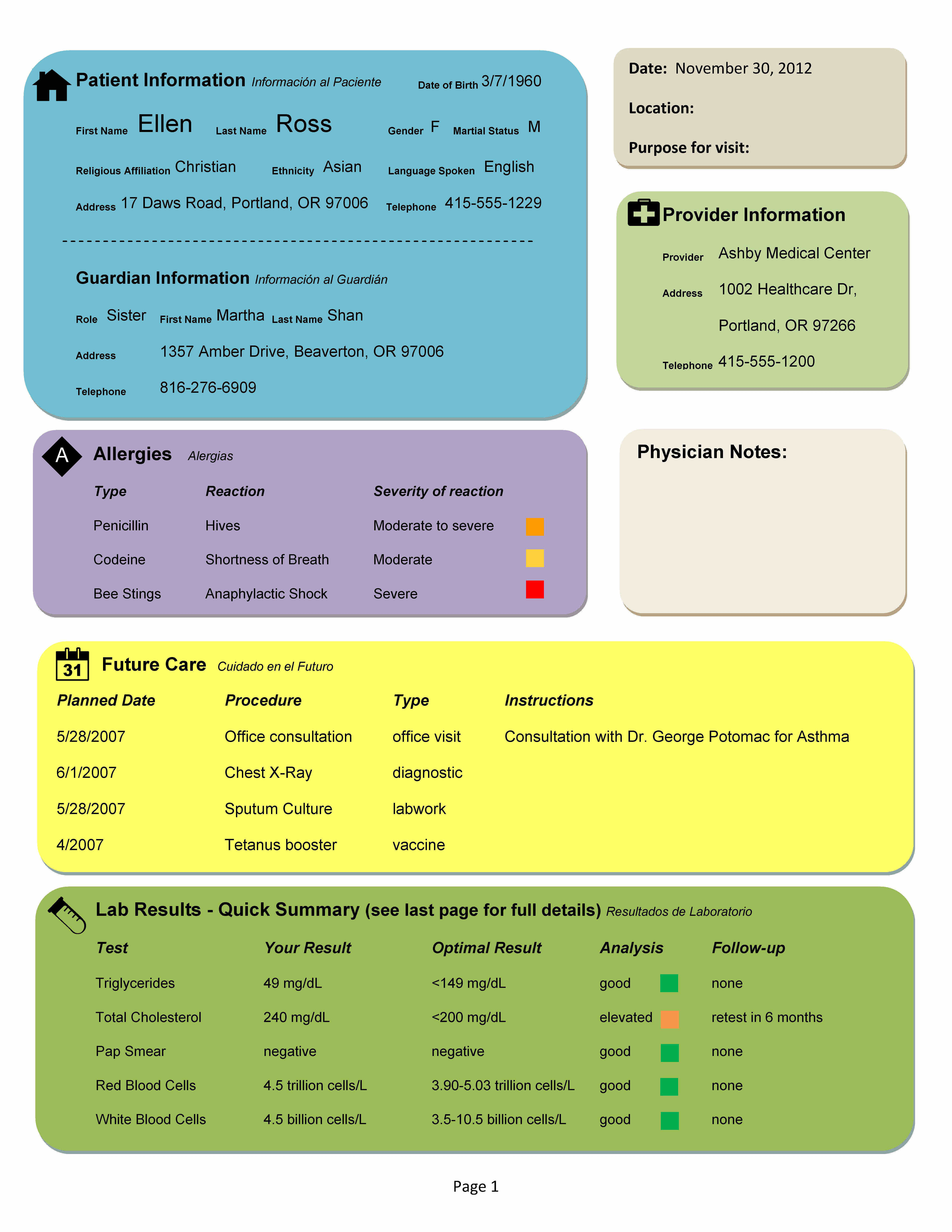 My proposal is a colorful redesign with easy readability and visual cues to pertinent healthcare information.
