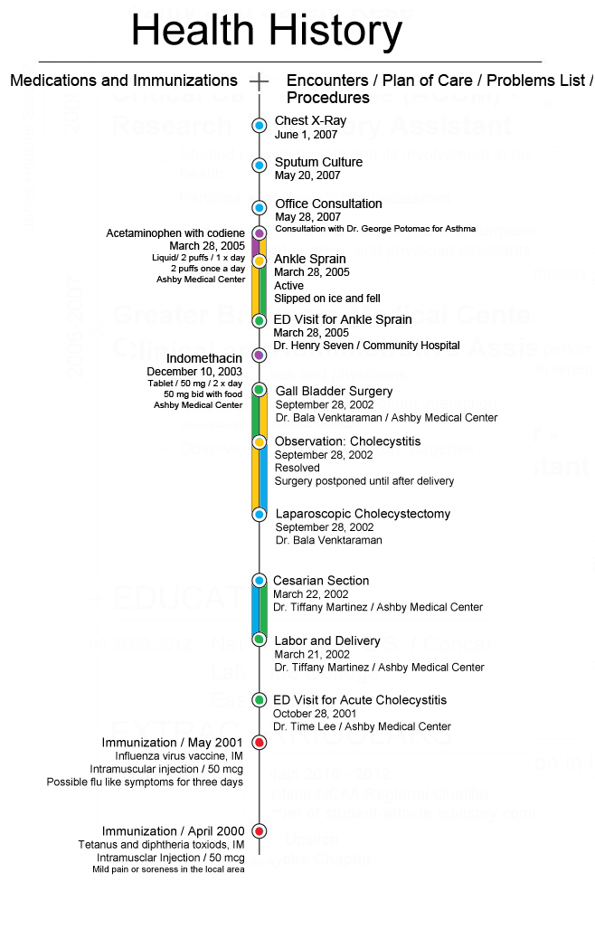 A simple yet elegant design. There is something for everyone. The 75 year old diabetic patient who visits the clinic multiple times a month to the 22 year old who just graduated college and has not stepped foot in the doctor's office in years. The first thing you notice, allergies and date of birth that are in an easily accessible location to promote patient safety from the first view. Then your eye travels down to the patient information that is easily understood by anyone. Next you look at the health history, which provides a "timeline" of the patient's health in chronological order, with emphasis drawn to more important events. After this your eyes travel over to the lab section, which provides results for the clinician and "what it means" for the patient. Once again the viewer is reminded of the patient's allergies. Finally they view "the next steps" or the take away message from the visit for the patient to refer to after the visit. At the bottom of the page, the viewer is reminded again of the patients date of birth, and space is left for other important information that is felt to be important to the organization.
