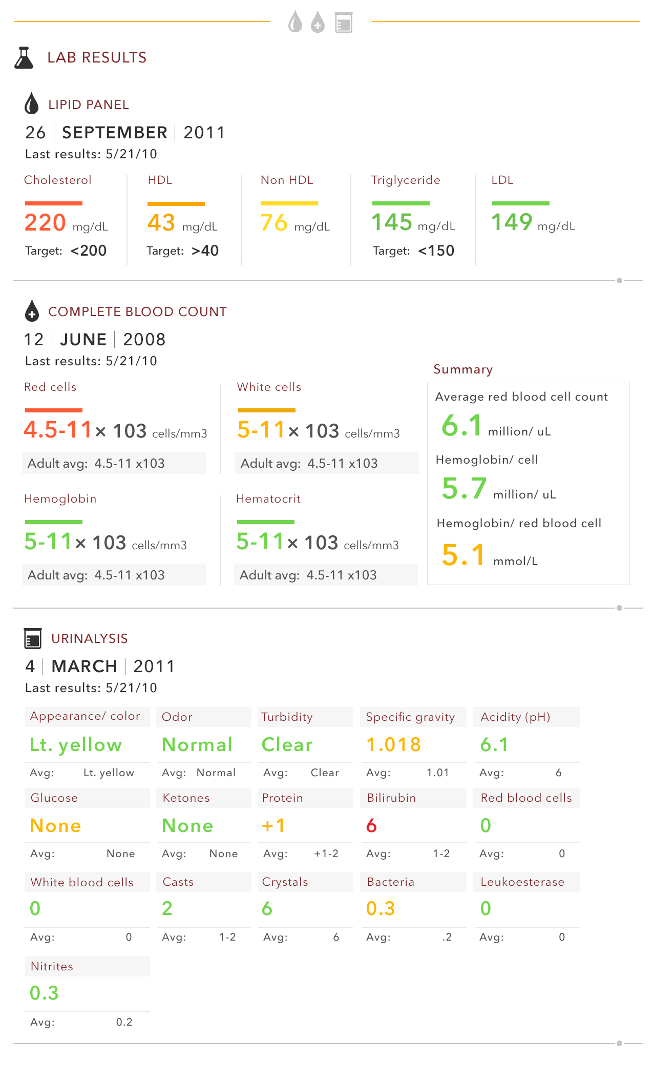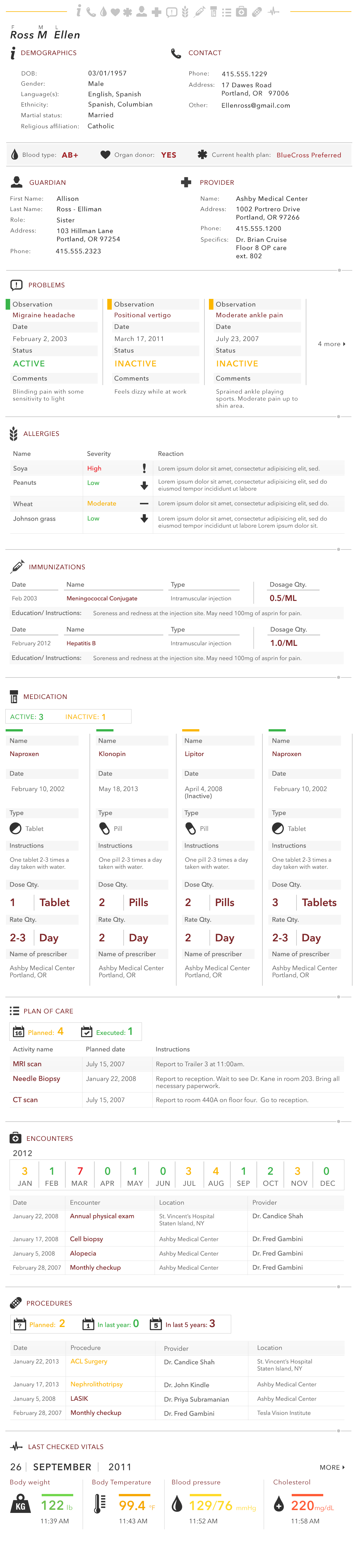 My approach with this challenge was to take the main categories and the data within those and repurpose them. I asked myself what types of things both doctors and patients alike would ideally like to see jump out at them about their EMRs. I came up with a few key points to address:
