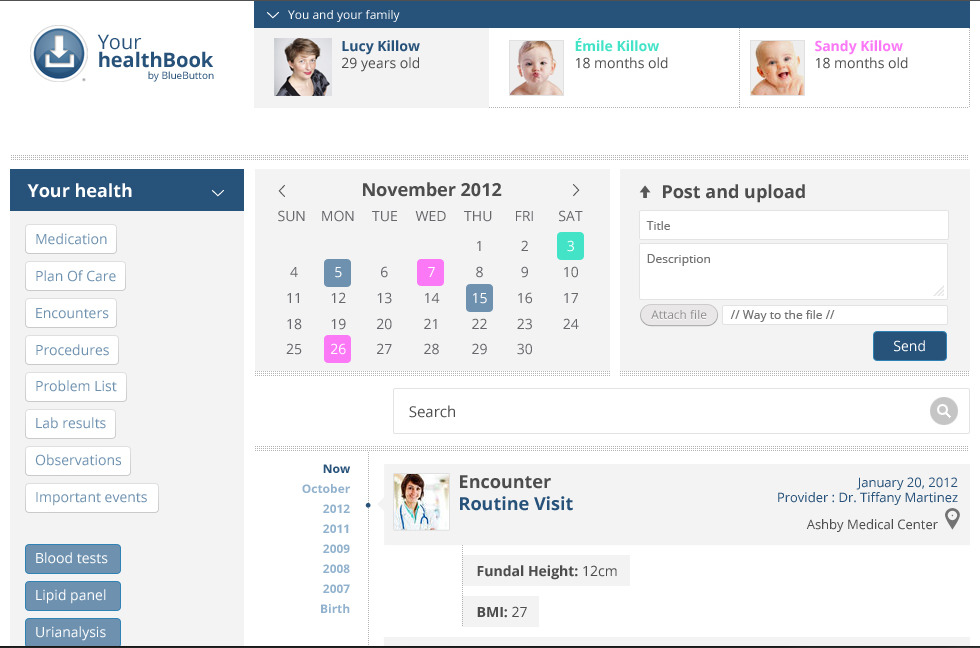 A timeline format makes sense to display chronological medical events. Because you have to be able to handle precise requests, we included a tagging system (on the left) and a search tool. The events are grouped in the timeline and the picture displays a photo indicating the source of the content.