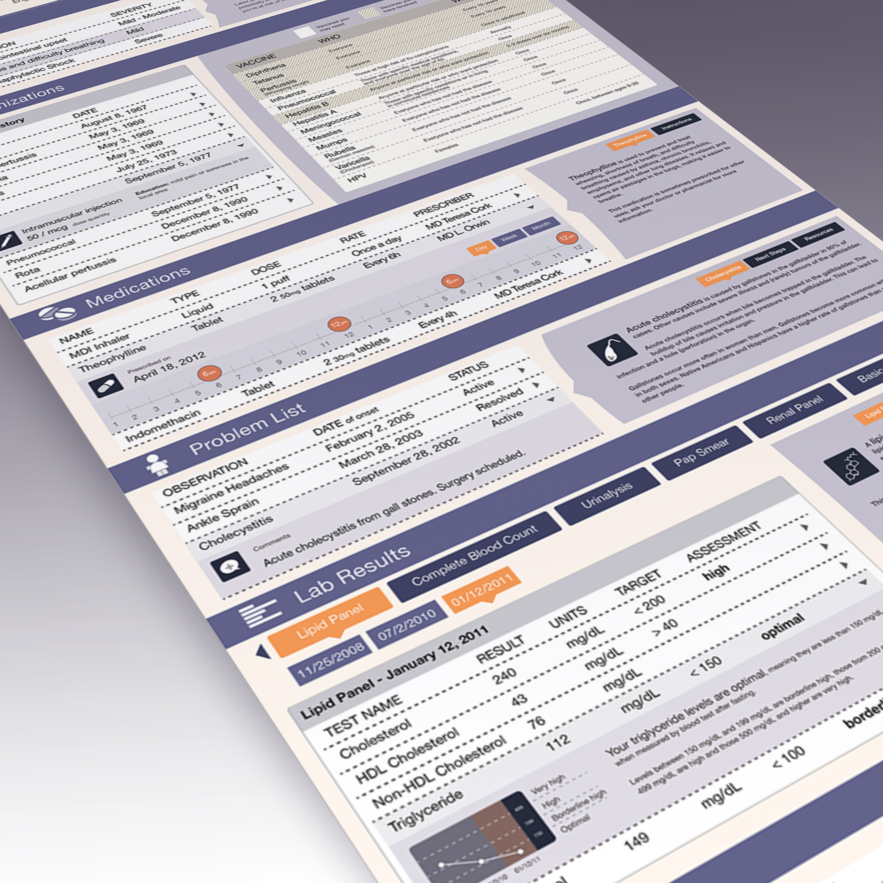 An interactive 'scroll' approach to the electronic medical record. Patient data are visualized as drillable line items on the left, and linked to contextual education materials on the right. When printed, all line items would expand to show the patient's complete record (right-hand text would be omitted from print-outs).