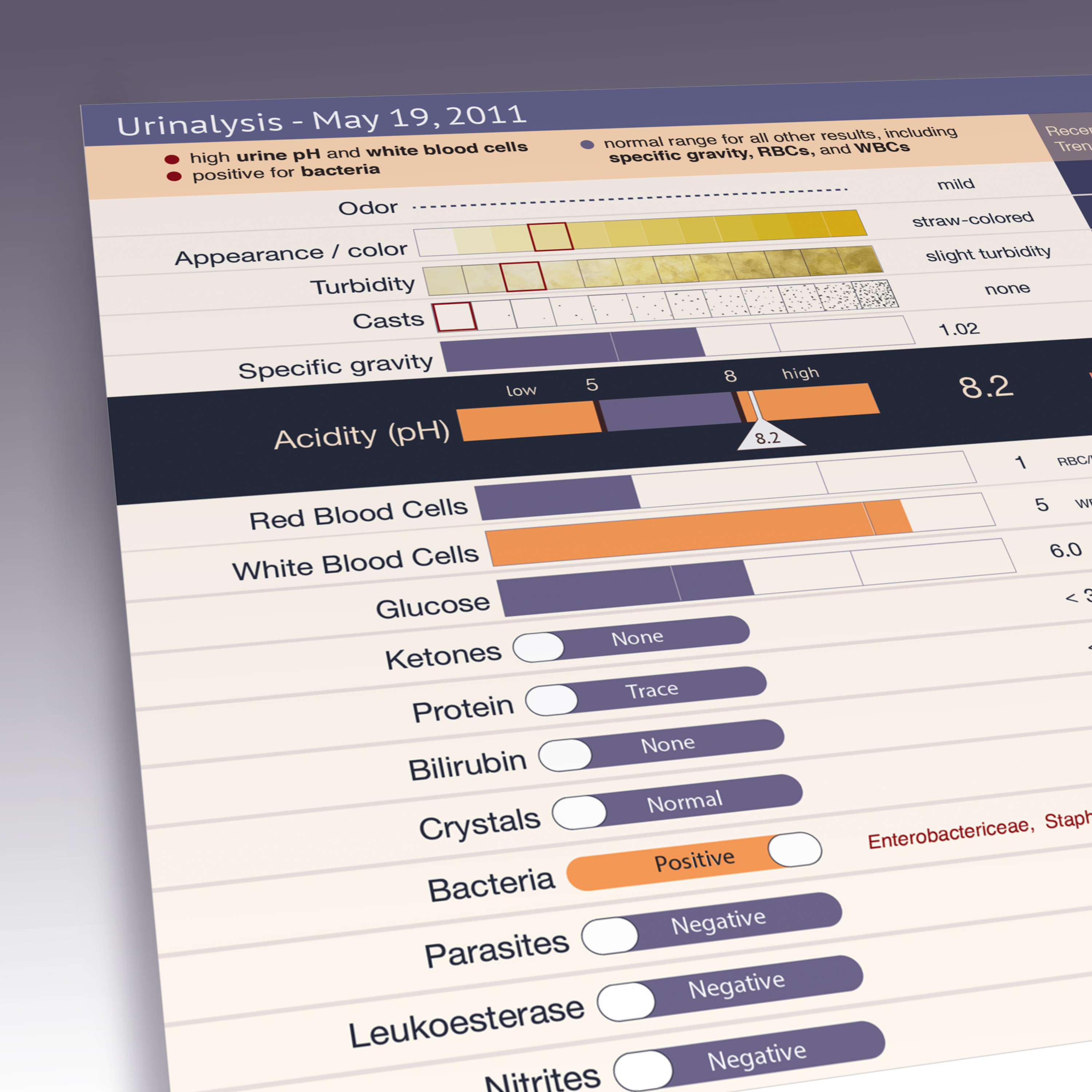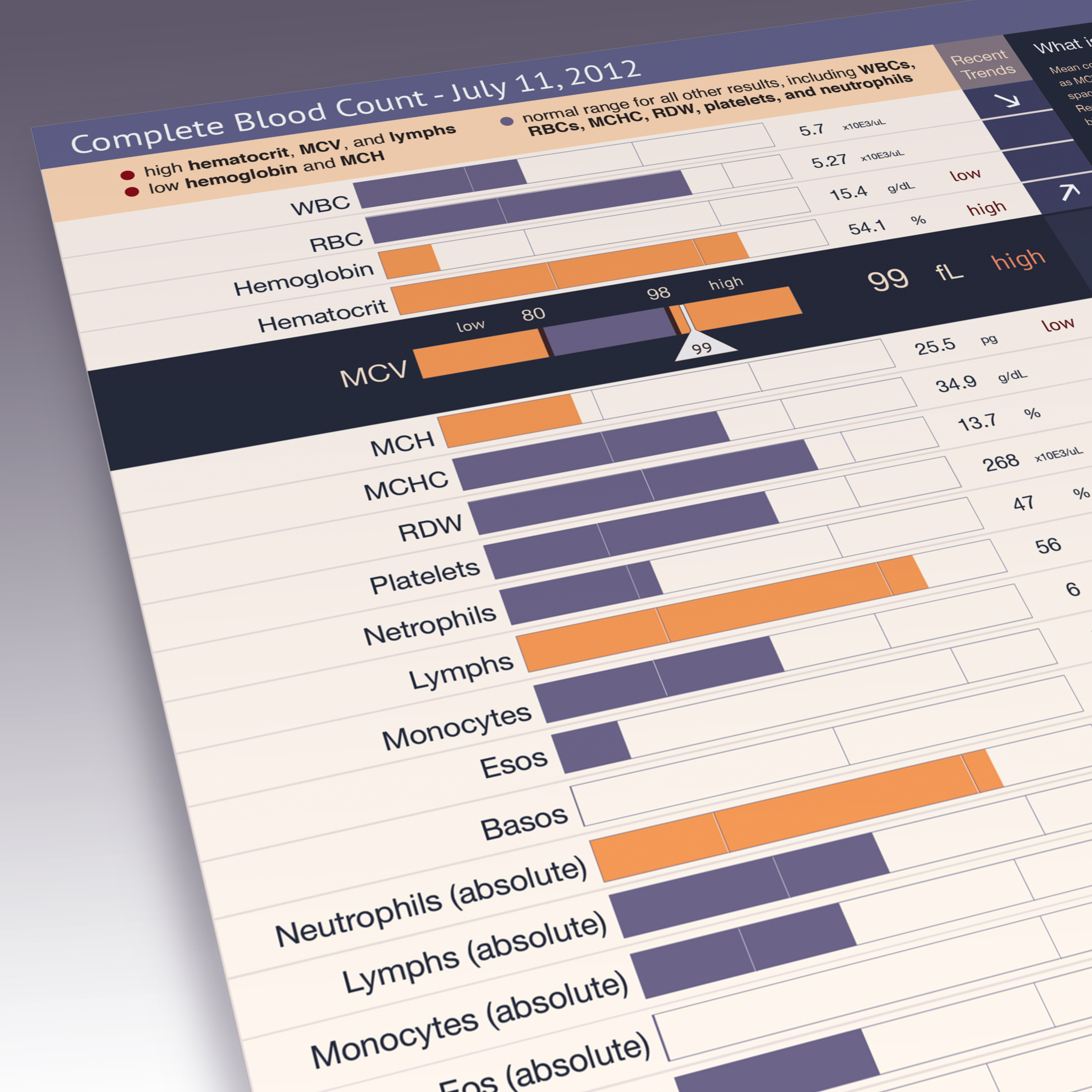 Also included is a more visual approach to lab results: using color to code for normal and abnormal values, showing trends, contextual information, and reference ranges for each lab result, and a quick summary of abnormal and normal results at the top of each report.