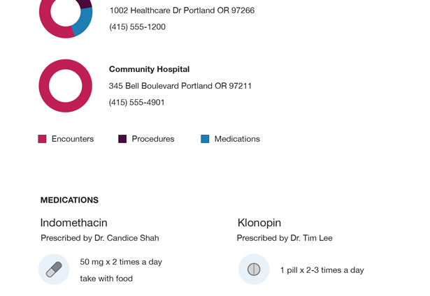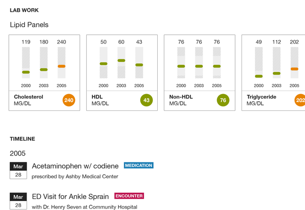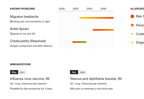 "Insight" provides a clear, concise layout centered on readability and a high signal-to-noise ratio. With this design, we explored the idea of storytelling around a patient's treatment history. Our goal was to enable patients, doctors, and supporting caregivers to quickly review critical facts in just 5-10 seconds, even in the middle of conversation. During our design process we removed every superfluous word, color, and stroke to bring forward the most critical medical facts and trends.