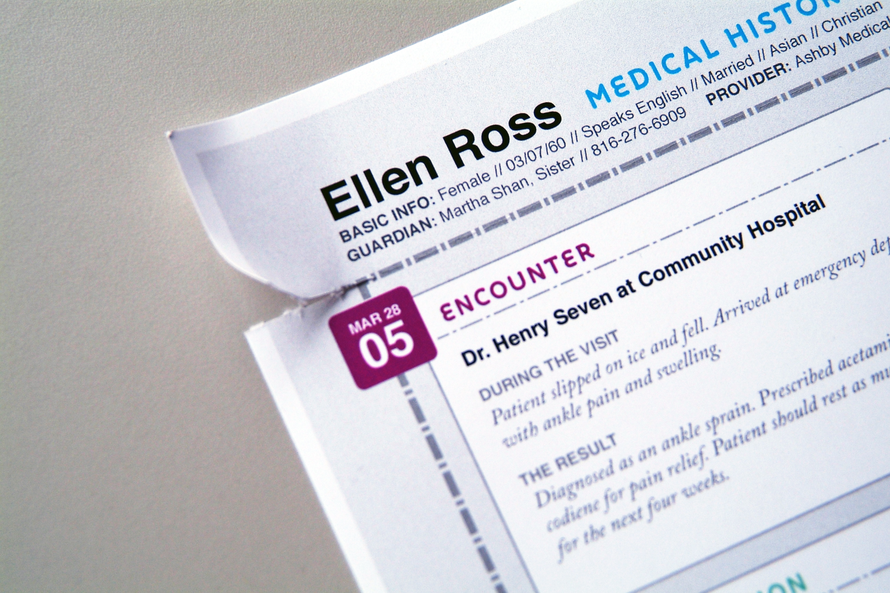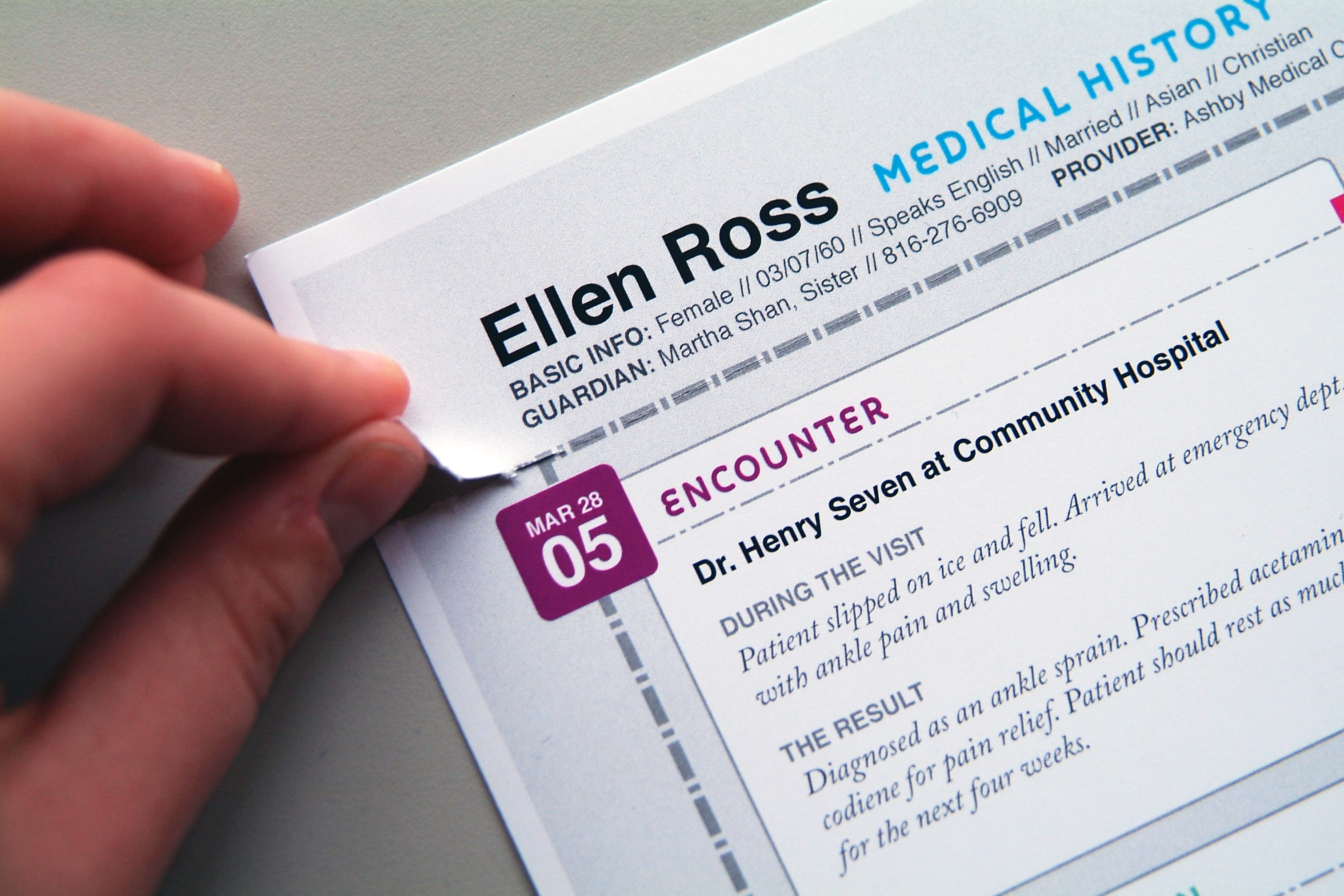 The Blue Button Narrative re-envisions the medical record to be a document that captures the relationship between various stages of life and actively engages the patient in their own health. Our team decided to regroup information based on their purpose, resulting with primary information on the front page, leading into secondary and tertiary information.