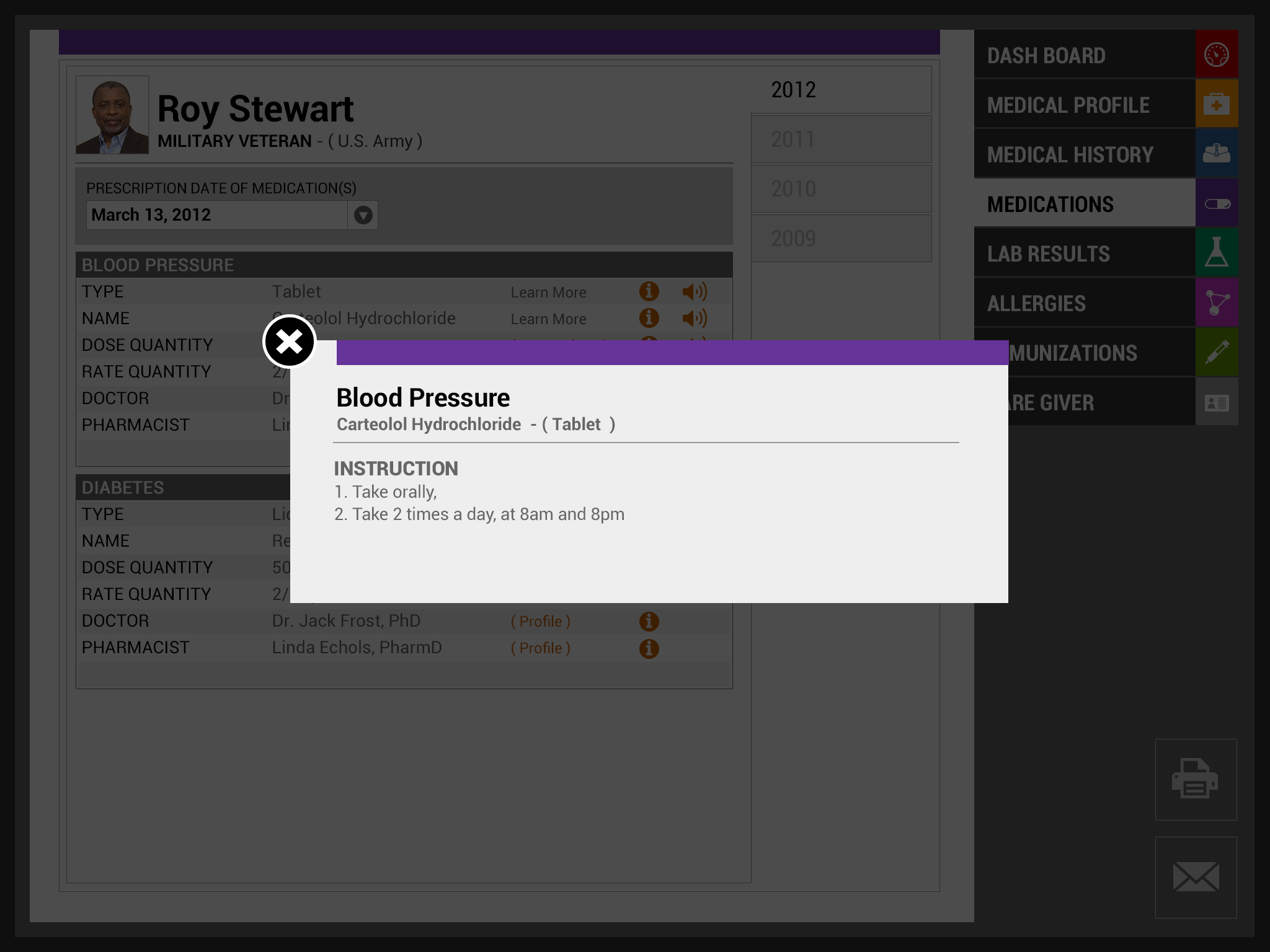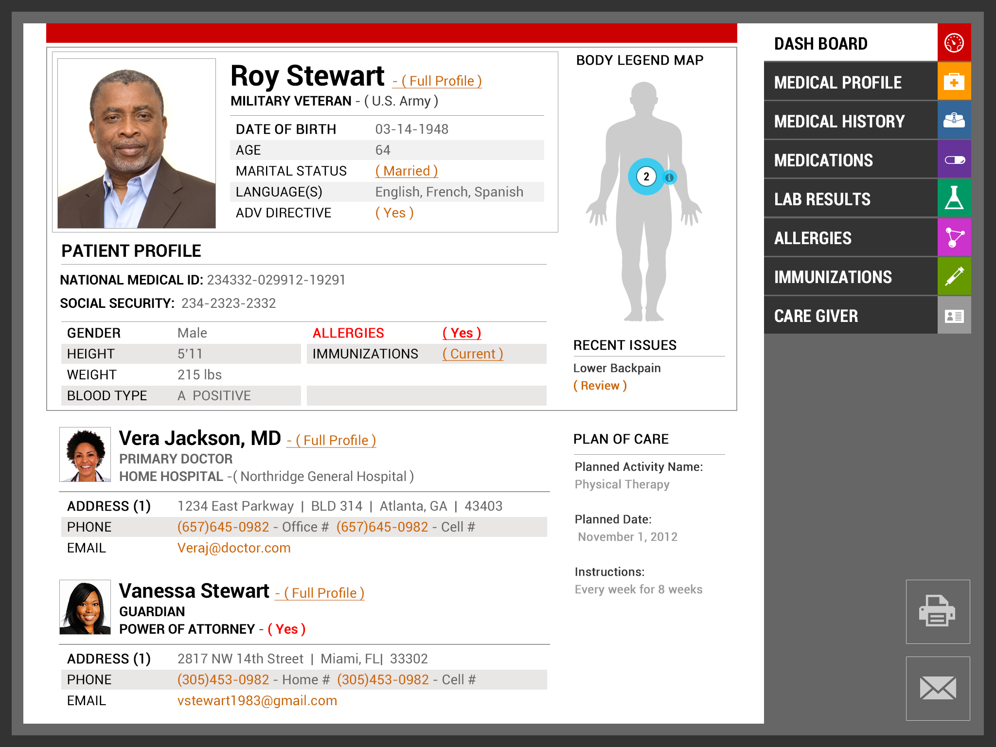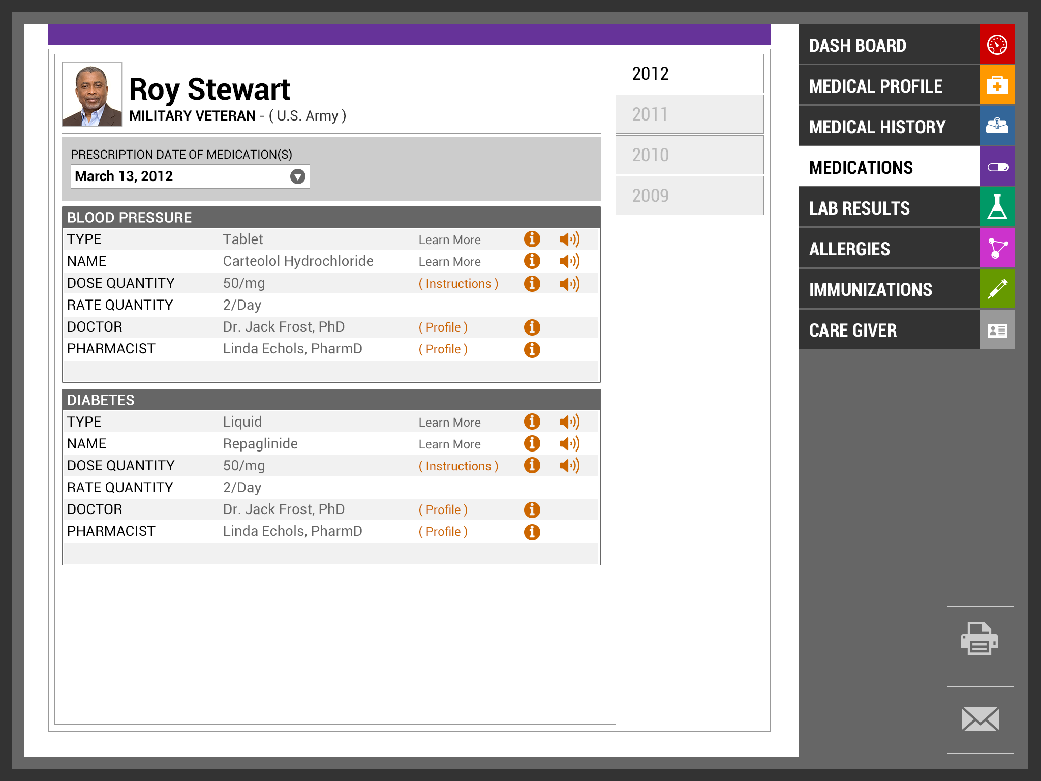 Team EmpowerVet is excited to present our vision of the redesigned VA Patient Health care record. Our focus in this project was centered on information design and layout: how do we redesign the information to be relevant across age group, various injuries/ailments, long term conditions, and keep it relevant for an entire lifetime. Healthcare today can be an emotional roller coaster for all patients, including our Vets, and their caregivers. It should not require super sleuth skills to decipher their own healthcare information. Our ultimate goal is the design and layout of the information for the ease of use of the patient, the caregiver and the medical professional in that order. We also took into account those who have impaired hearing or reading, as well as those where English is a second language (in fact the caregiver may be the one where English is a second language). We hope that our work will be utilized to improve healthcare for all patients, starting with our US Vets.