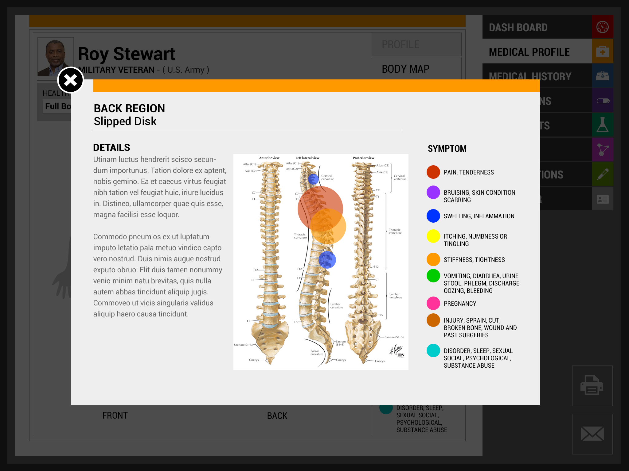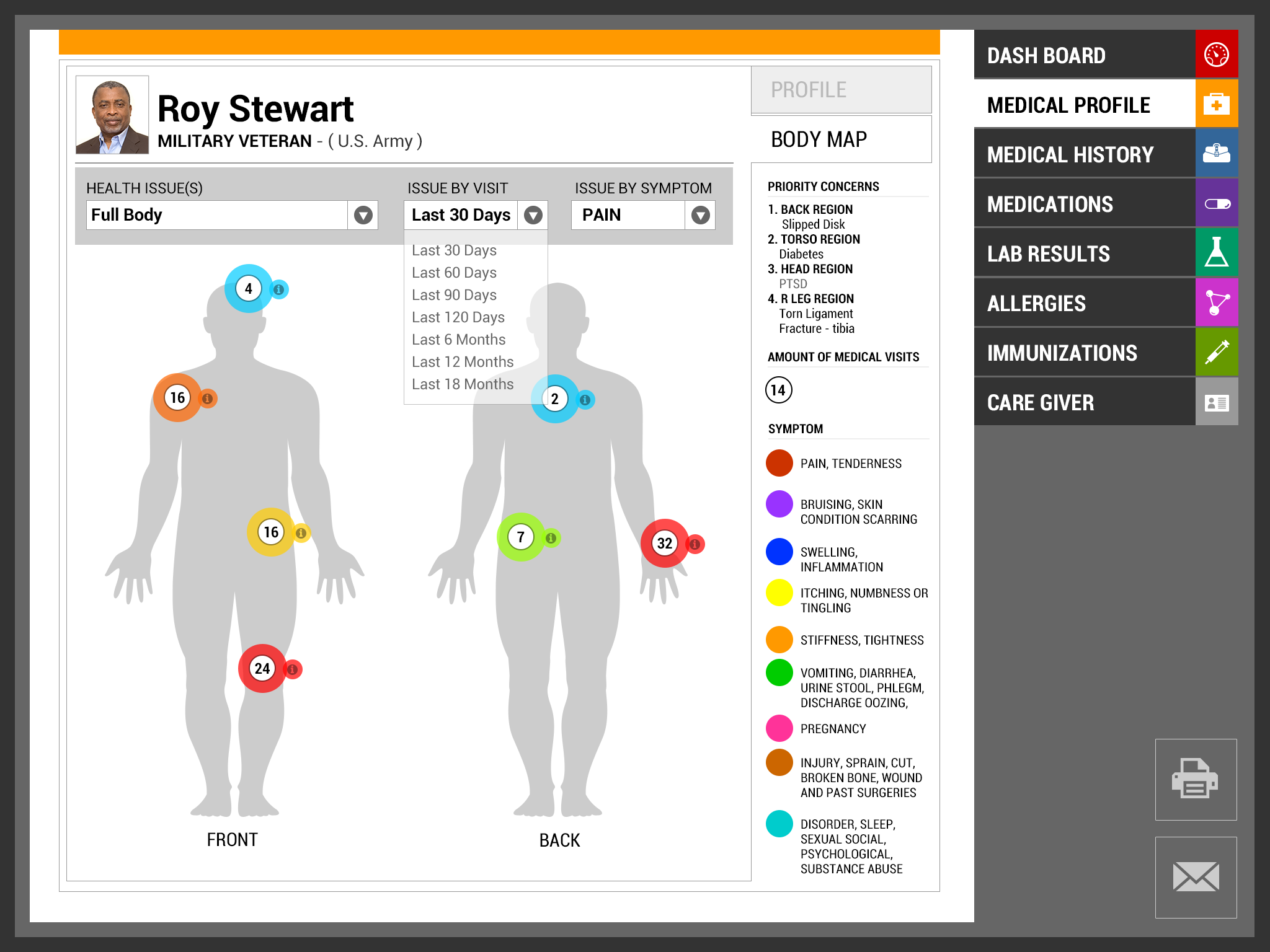 Totally agreed that design and layout can totally change the way we use and understand information. (Even our own.) I especially like the use of the visual human body, rather than textual for reference. On some of the measurement data I would include color coding and more info-graphic style on important measures. To give an equal visual cue to the user. I am curious if there is any unified or standardized database framework being proposed or in existence for this and other apps.....