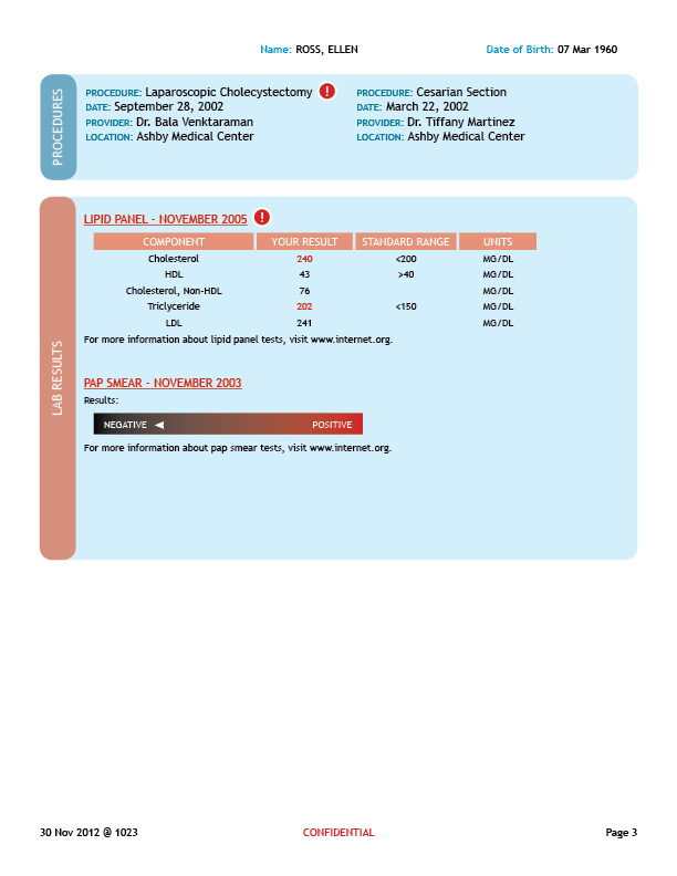This submission is for the Health Design Challenge Patient Medical Record. The design is to showcase a patient CCD is a new way that is useful and meaningful to both the patient and the medical practitioners.