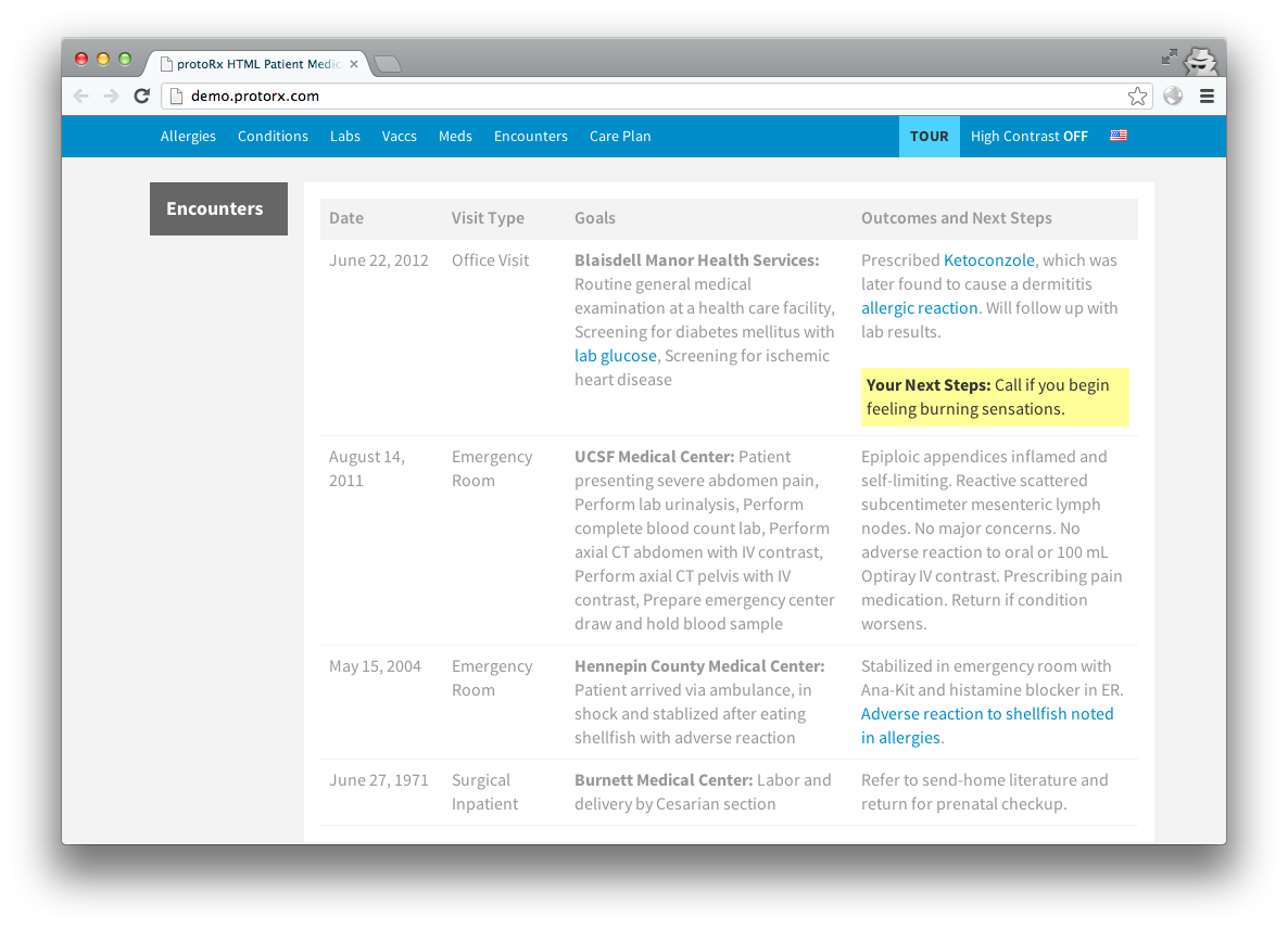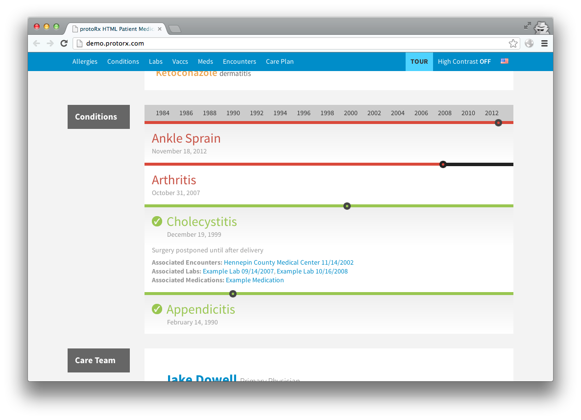 protoRx contains patient biographical information, allergies, a timeline of medical conditions, a listing of a patient's care team and upcoming appointments, lab results with graphs, vaccinations with alerts for past-due immunizations, a listing of prescriptions color coded by type, and text listings of provider encounters. protoRx is built using responsive HTML5, CSS3 and JavaScript, and it works on computers, tablets and mobile devices, and gracefully degrades for legacy browsers. A 'high contrast' link at the top of the page assists those with low vision and the design is printer-friendly. Language options can be added to make protoRx usable for non-English speaking patients. protoRx has been open-sourced on GitHub at https://github.com/webster/protorx