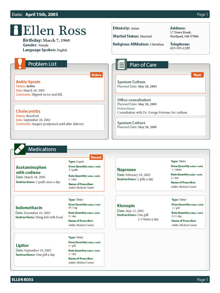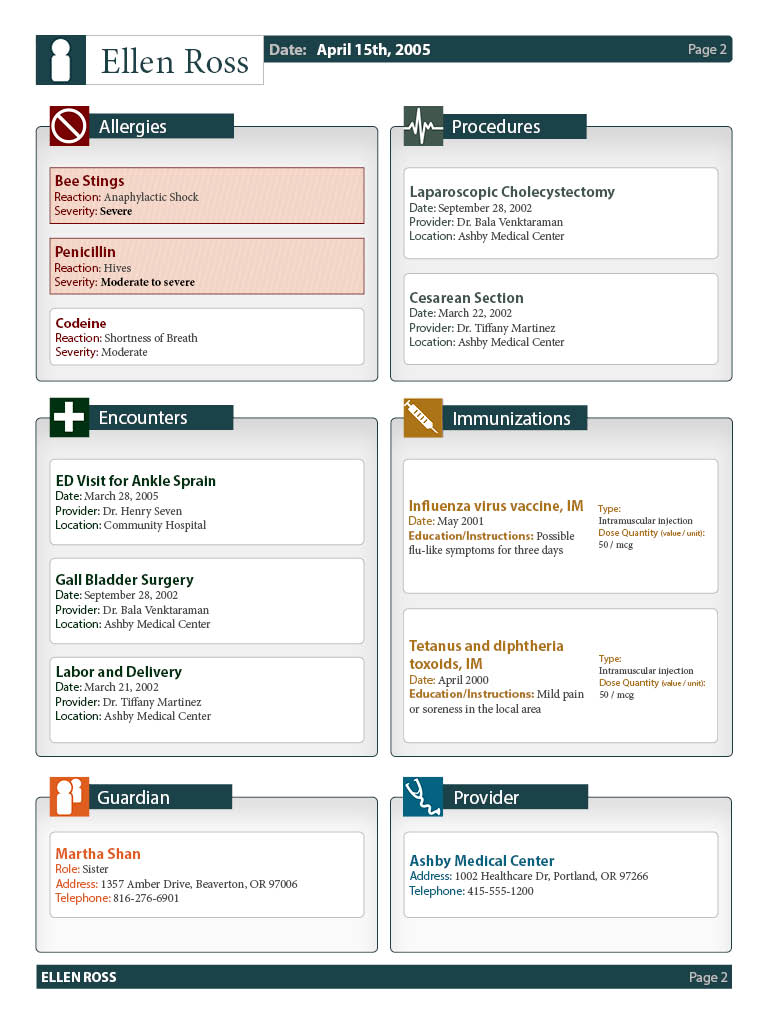 This design uses icons, color, size, typography, and shape to display information in a quick-to-digest way. The document was built using responsive design principals. If one section has more information than most, it can easily become a full-width column to accommodate the information. The medication section is a good example of this type of responsiveness.
