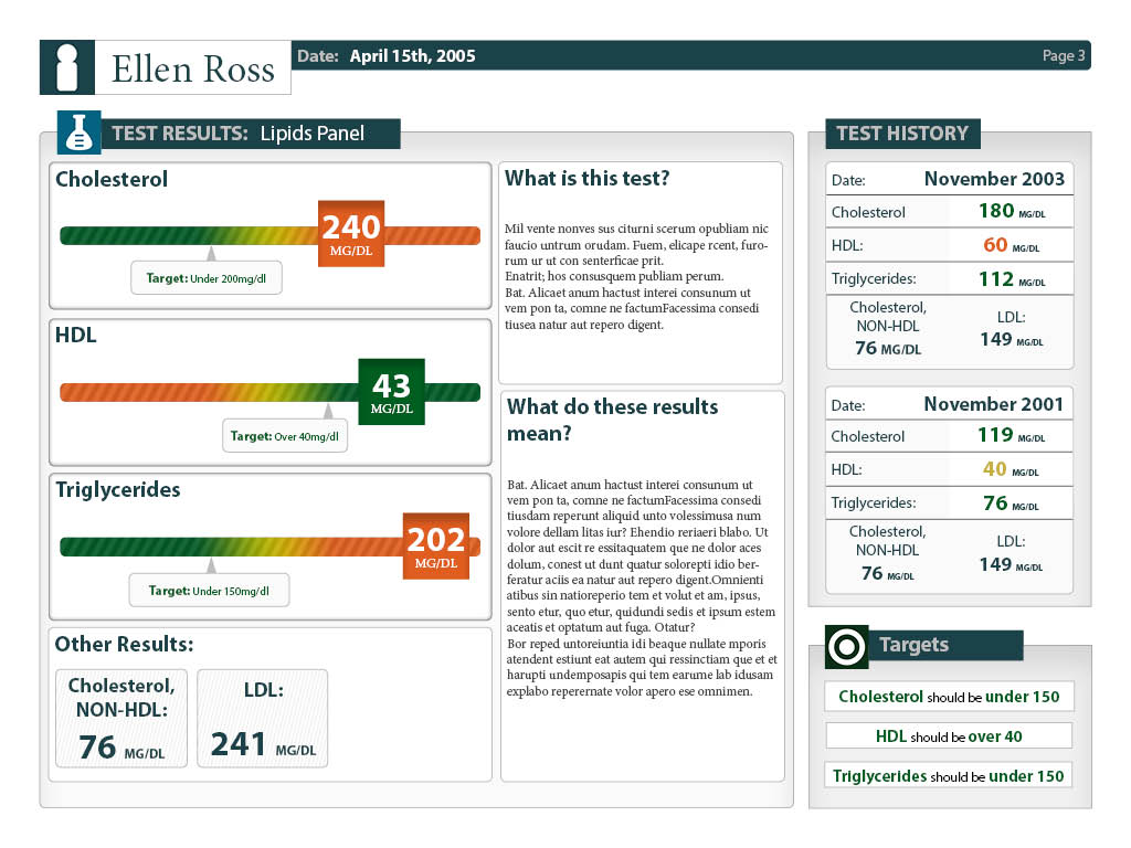 The lab results page gives a simple, easy-to-understand graphic representation of the results. Important results are highlighted, and additional results are designed to be present without being distracting. Once again, the use of color, shape, icons, and typography all contribute to making the document efficient to use.