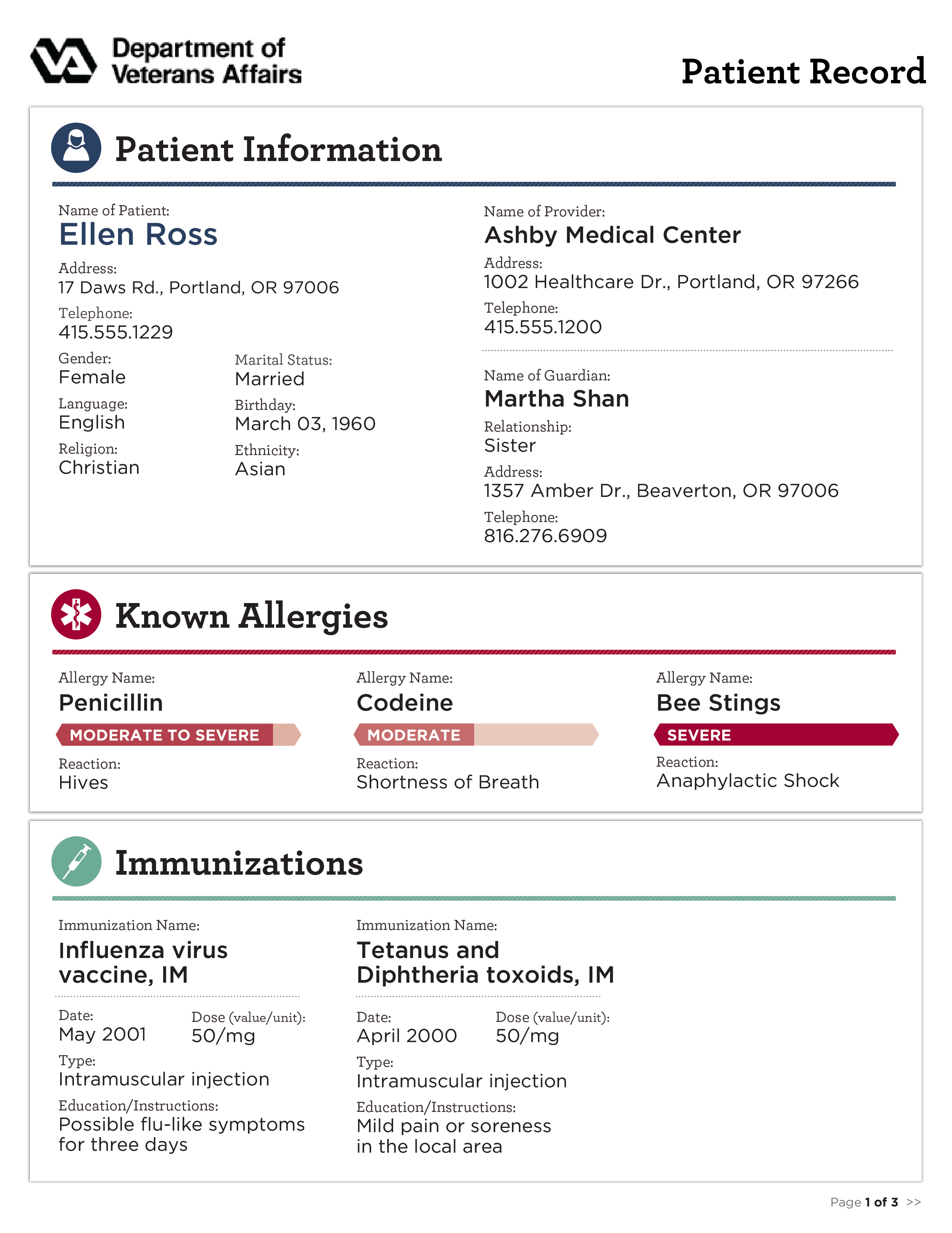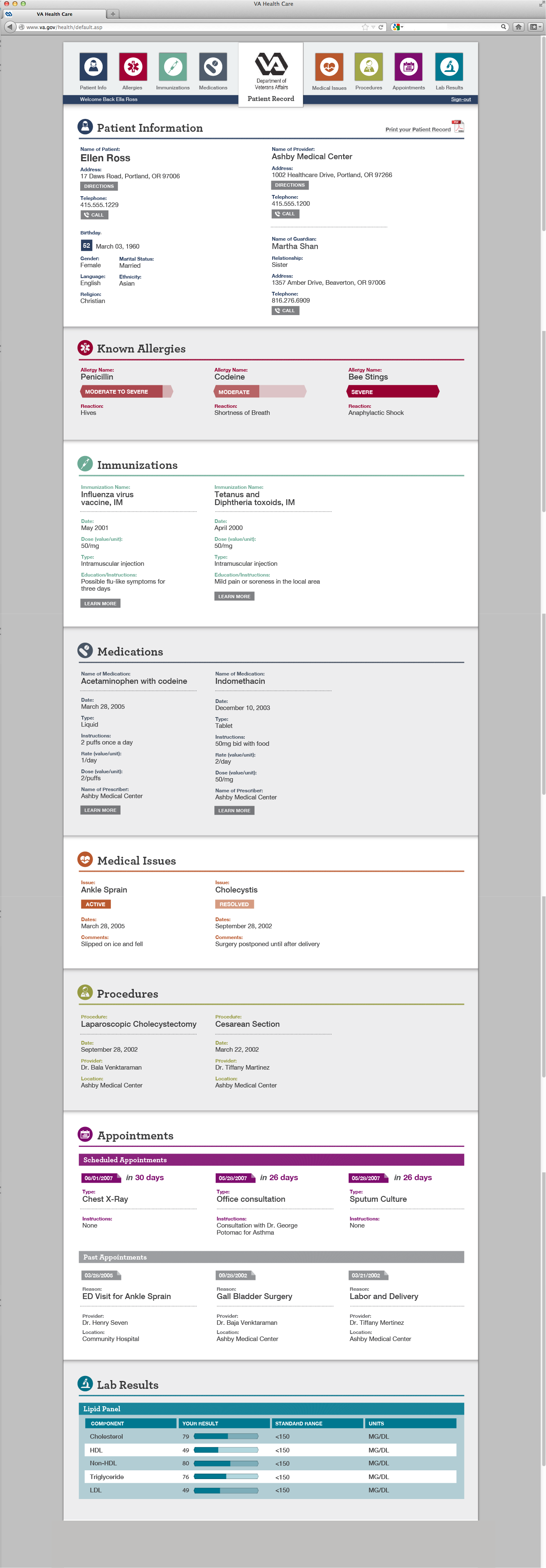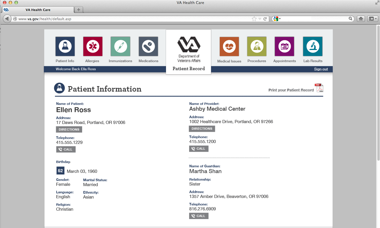 In addition, for the Web we added some interactive buttons and functionality to make it even more useful; For example - an age can be calculated based on a birthday date, directions can be provided based on an address, and days left for an appointment can be presented (rather than just a date). Finally, a permanent top navigation bar allows users to click on any of the sections and have the page scroll to that area on the page, or simply scroll through the page as if it is a long printed document. Again - thinking about useful yet easy user experience.