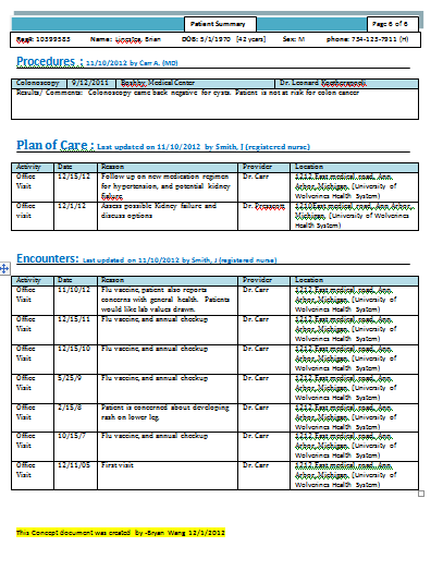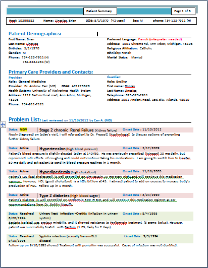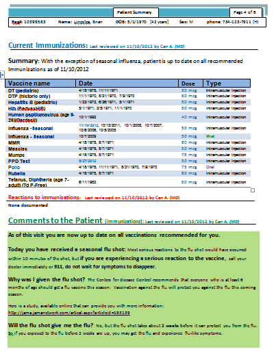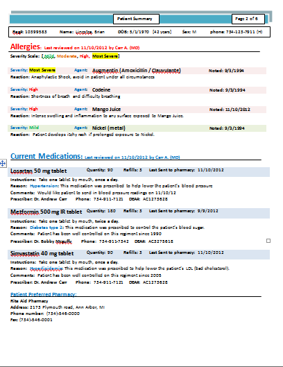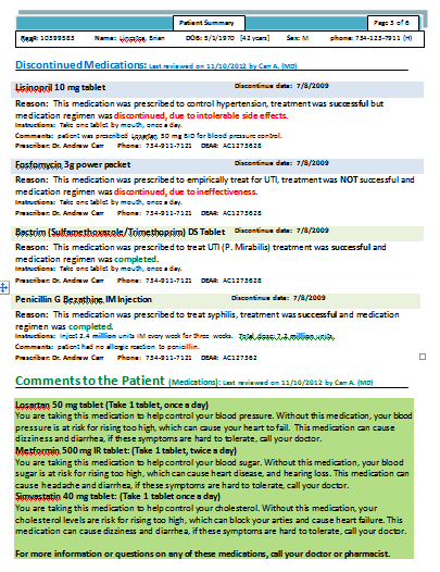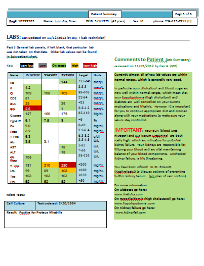 I designed this submission to be incredibly efficient for a physician or other health care provider to read and get relevant data from. I also designed this submission to be readable by the patient; there are areas within the EMR that are designated to provide information and descriptions to the patient. They color coded in green and labeled with a big header: “Comments to the Patient.” In order for this to be feasible in a real world health care practice, the patient information comments would have to be largely computer generated, with the physician being able to edit or add to these patient comments.