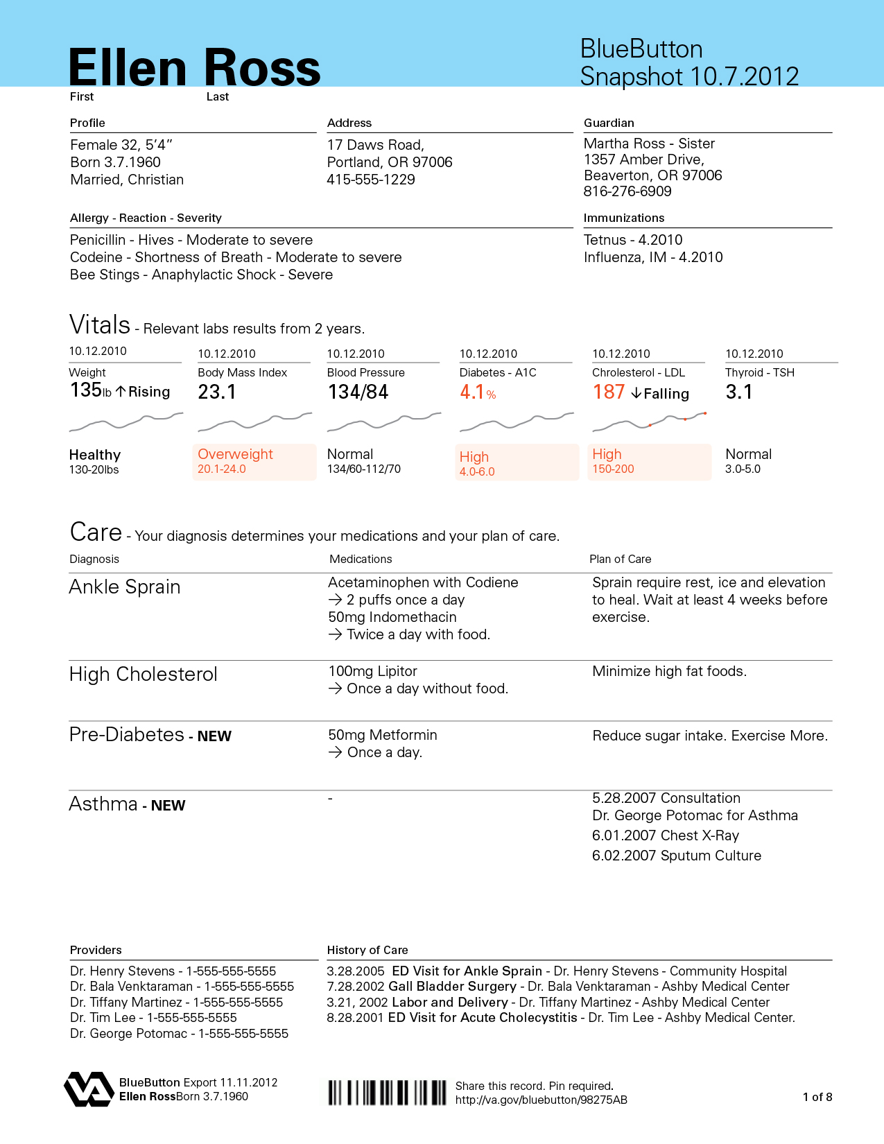 This one page summary is designed to help you understand your most important labs and plan of care in a one-page actionable snapshot. You Rx's and plan of care are organized by diagnosis so the patient can understand their necessity. A short url/barcode enables the patient to share/access his record digitally.